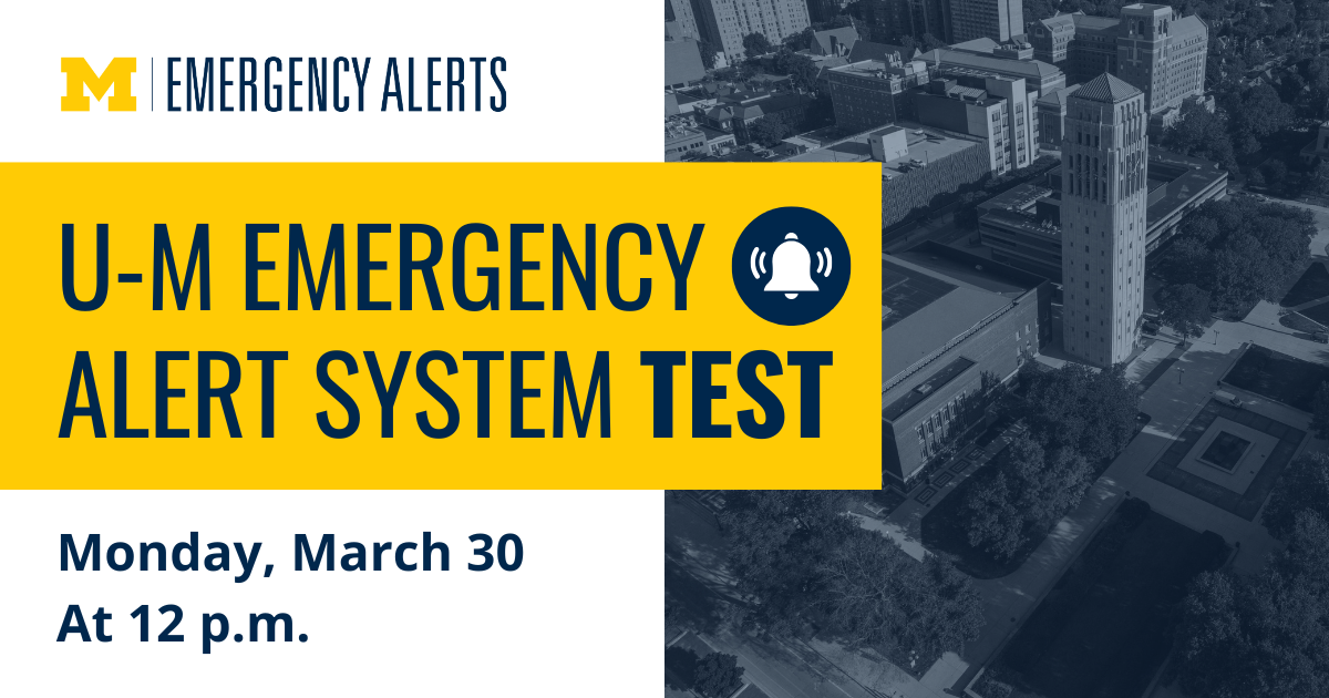 The University of Michigan Division of Public Safety and Security will test the UM Emergency Alert system on Monday, March 30 at noon for the Ann Arbor campus. The activation is being performed as part of annual testing to ensure…