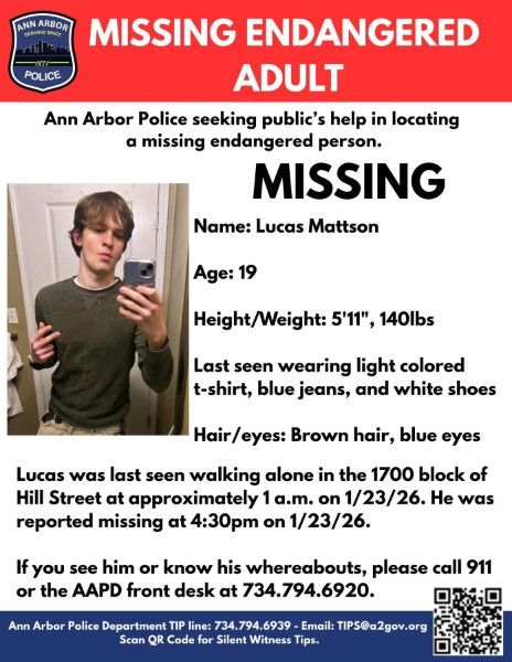 AAPD UPDATE: “Investigation update from AAPD: A body has been recovered in the 1900 block of Cambridge Road at approximately 12:05 p.m. following an extensive coordinated search effort with the University of Michigan Police Department. The body has been identified as 19-year-old Lucas Mattson, who was last seen at 1 a.m. on 1/23/26 walking alone in the 1700 block of Hill Street without a coat and reported missing to AAPD approximately 15 hours later.