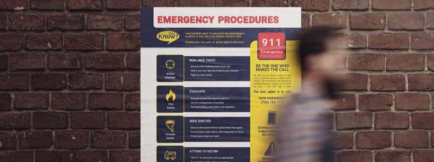 The Division of Public Safety and Security offers an 11″ x 17″ poster that details the emergency procedures regarding eight common hazards.